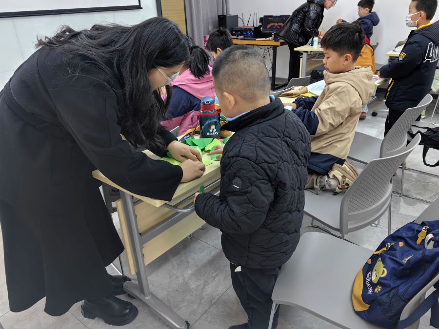 活动期间,孩子们通过亲身体验非遗技艺,展现出令人惊喜的创造力与学习潜能。在簪花制作课上,有个小男孩以往因手工制作不够精巧,总是羞于展示自己的作品。但在志愿者耐心细致的分步指导下,他成功制作出一枚以宋代“一年景”花冠为灵感的多层叠瓣发簪。当作品被展示在教室的展示区时,他兴奋地拉着小伙伴,反复确认:“这真的是我做出来的!”