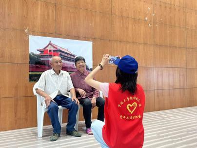 小分队利用手机,将天安门作为背景,邀请老人坐在椅子上。老人们笑容满面,眼中闪烁着期待。随着快门轻响,一张张“亲临”天安门的照片定格美好瞬间。
