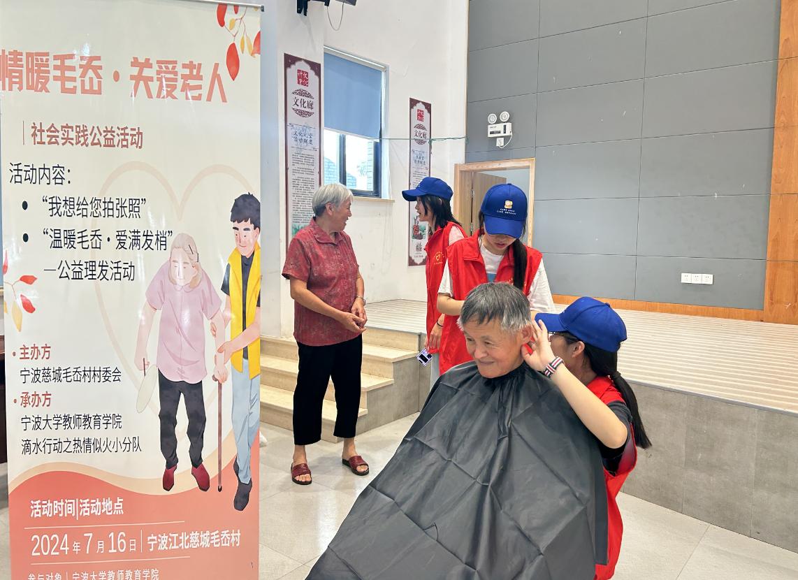 2024年7月19日,为促进乡村振兴事业蓬勃发展,宁波大学聚焦农村养老,组织教师教育学院多名大学生志愿者组成“滴水行动 热情似火”社会实践队,前往宁波市慈城县毛岙村开展一场以“情暖毛岙·关爱老人”为主题的敬老爱老公益活动。实践队以毛岙村文化礼堂为根据地,制定了匠艺精修,容光焕发—义剪、雅韵镜前,定格岁月—义拍、情暖人间,慰问传爱—义访等一系列围绕敬老爱老为核心的行动计划。本次社会实践活动旨在改变目前老人精神物质生活环境,促进老年人进一步融入社会,积极生活,“滴水行动 热情似火”社会实践小分队开展系列活动。