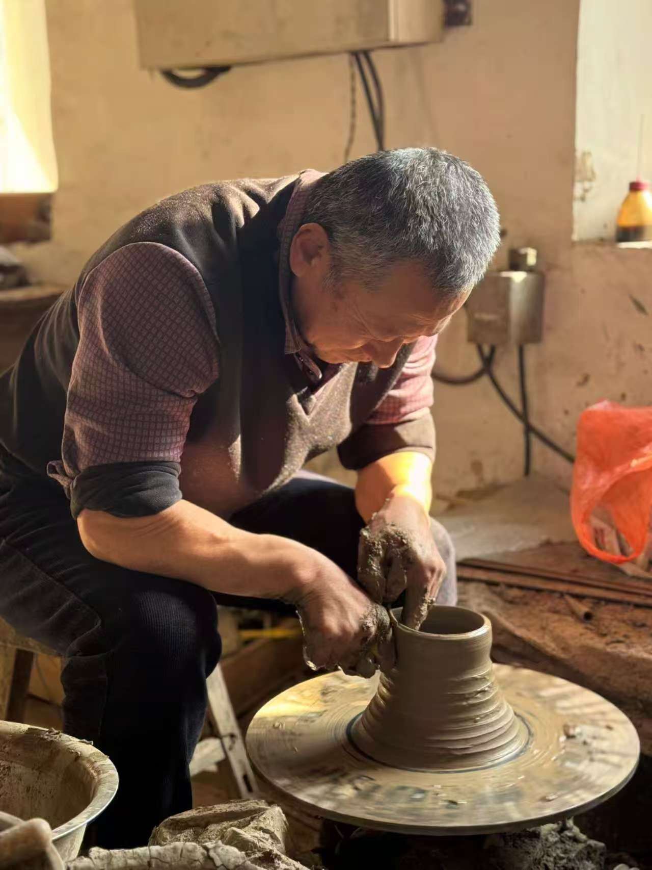 在青岛胶州,实践服务团拜访了黑陶传承人叶孝忠。叶孝忠不仅耐心解答团队成员的疑问,讲述黑陶的历史渊源、独特魅力和传承困境,还亲自上阵示范拉坯工艺。成员们纷纷上手体验,在旋转的泥坯间感受传统技艺的温度与力量,将理论知识与实践紧密结合。