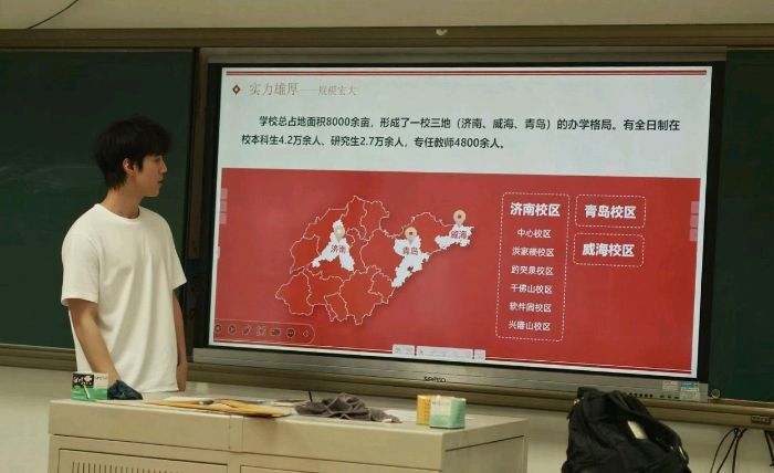 宣讲中,林辰轩对照精心打磨的PPT,从创办初心讲起山大历史,细数抗战时期师生辗转办学的坚守、新时代的蓬勃发展,让同学们触摸到百年学府的厚重。他生动描绘校园生活:学术社团的思维碰撞、文艺社团的精彩展演、体育社团的热血赛事,还有配备空调与独立卫生间的温馨宿舍,让大家仿佛提前体验山大生活。