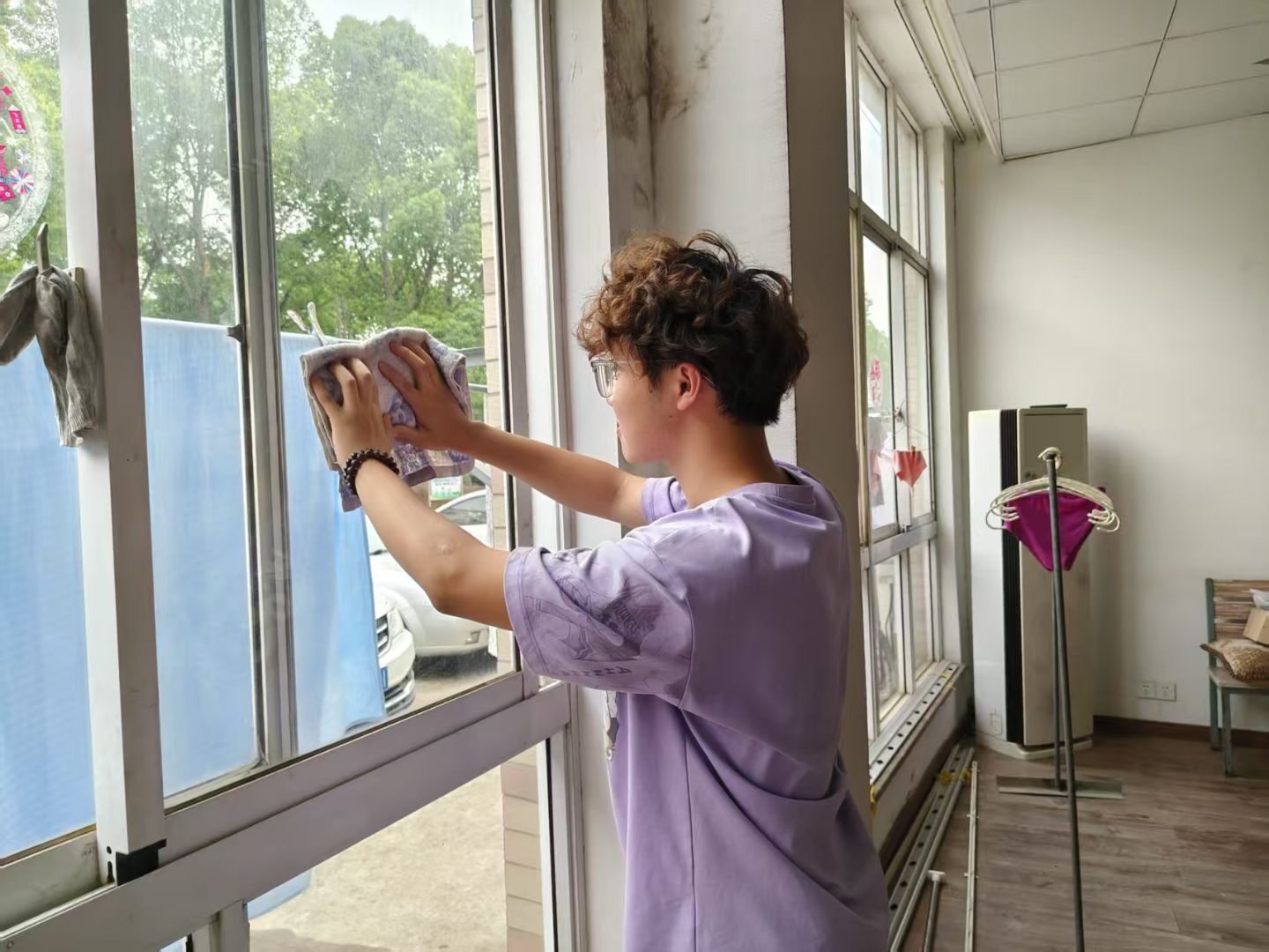 一、晨光中的忙碌身影上午 8 时整,队员们在公寓大厅完成简单的分工后,迅速投入到卫生清扫工作中。队长拿着拖把率先走进三楼活动室,这里是老人们日常聚集的场所,地面上散落着些许零食碎屑和水渍。他半跪在地板上,用抹布蘸着消毒水仔细擦拭墙角的污渍,额前的碎发被汗水浸湿也顾不上整理。“奶奶,您先到走廊坐会儿,这里擦完地有点滑。” 他一边干活一边轻声劝离坐在旁边的张奶奶,老人拄着拐杖挪到门口时,还不忘回头念叨:“孩子慢点,别摔着。”