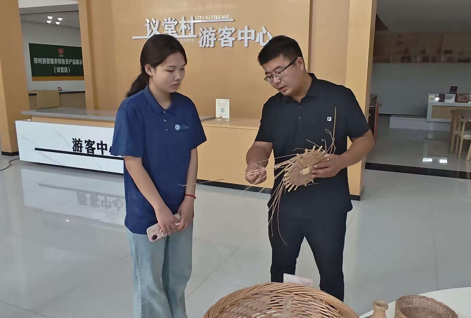 村游客中心和农产品展示馆里,实践团成员们详细了解了议堂村的特色产业发展情况。依托当地丰富的红色文化资源和传统柳编工艺,村里打造了红色研学基地和柳编产业园。更令人欣喜的是,通过土地整合流转,村里建起了连片的现代农业示范园,金黄的稻浪与翠绿的柳林相映成趣。"产业兴旺是乡村振兴的关键,我们要让每一寸土地都发挥最大效益。"村支书李坤指着长势喜人的庄稼,向队员们介绍着村庄的发展规划。队员杨泽凡深有感触地说:"只有产业振兴了,村民的腰包才能真正鼓起来,乡村振兴才有持久动力。"