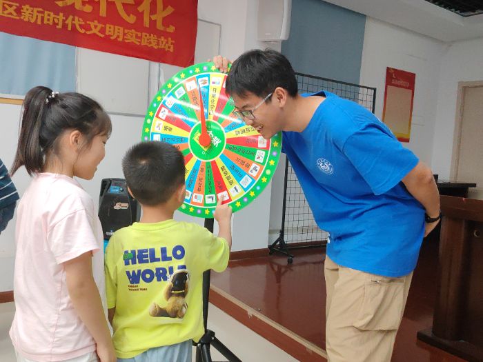 7月18日,团队走进秦淮区红花街道龙翔雅苑社区,以“宣讲+游戏”模式延续绿色薪火。环保知识有奖问答吸引孩子们踊跃抢答。团队还通过转盘游戏等寓教于乐的形式,让枯燥分类知识“活”起来,提升社区宣传实效。