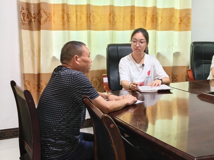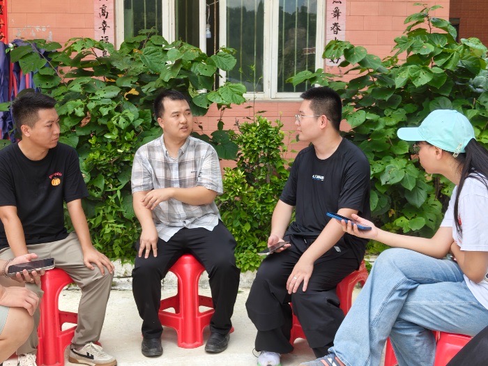 基地考察后,团队转赴小关村与村书记展开座谈。村书记展开一幅“产业地图”:“全村800多户中超500户种植山银花,大部分生花由本地十多家加工厂收购,成品主销成都、长沙药材市场。”面对价格波动,村里通过合作社引导农户精细化采摘,并全力打造“朵花”自有品牌以提升附加值。他还提及采摘季劳动力紧张时需外调人手,以及结合避暑季探索“金银花+民宿”文旅路径的初步设想,让游客带走的不只是产品,更是山野记忆。访谈尾声,书记拍拍团队成员的肩膀,笑着说道:“我们非常欢迎也非常感谢大学生们来‘三下乡’调研,运用你们的所学知识调查产业发展实际情况、提出切实可行建议,并且为山银花产业发展做宣传。”