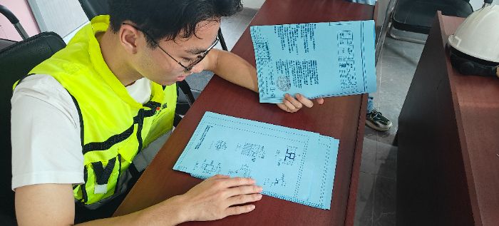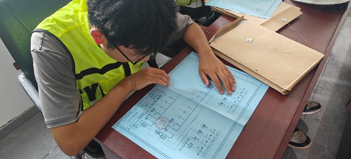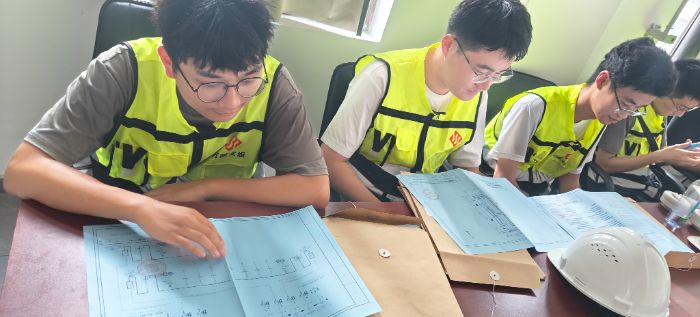 图纸研析环节,实践队成员对照项目配电室平面布置图、高低压系统单线图、二次回路原理图等技术资料,逐层梳理供电链路逻辑与保护配置策略。工程师就图纸符号释义、容量核算依据、电缆选型标准等内容进行延伸解读,引导队员将理论范式与工程实景相互印证。