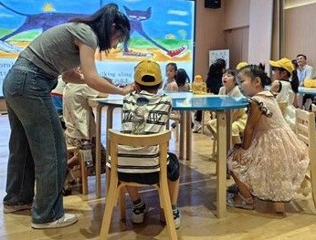 活动现场,主讲志愿者通过生动的肢体语言和丰富的表情,带领孩子们走进Pete the Cat的奇妙世界。当讲到Pete的白鞋子变成红色时,志愿者拿出准备好的道具鞋子进行演示,引发孩子们阵阵笑声。