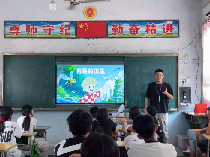 河南商丘的支教工作中,团队在多所乡村小学开展教学活动,以探索高校与乡村之间可持续的教育模式。7 月 8 日至 18 日,张博阳在睢县乡村小学,结合当地自然环境优势,开设 “有趣的仿生”“动物法庭” 等生物学课程,巧妙融合生物学、物理学与逻辑学知识,极大拓展了学生们的视野。在整个教学实践结束之后,他主动反思不足,认识到教学要从乡村学生的认知水平以及生活环境出发,从而形成贴合实际的教学思想。7 月 12 日至 8 月 13 日,徐可昕在包公庙小学,围绕 “观察现象 — 探究原理 — 实践应用” 主线,结合农村特色设计 “贴近生活” 主题活动。通过土电话制作、彩虹瓶实验、生态瓶制作等低成本活动,渗透环保理念,让学生认识到科学的实用性与可及性,展现了师范生因地制宜开展教学的专业能力。