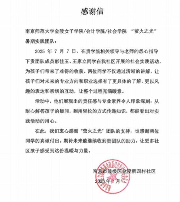 2025年7月7日,南京师范大学金陵女子学院/社会学院/会计学院“萤火之光”暑期实践团队,在南京市鼓楼区宝塔桥街道金陵新四村社区党群服务中心开展了一场别开生面的职业启蒙教育活动。团队成员彭佳玉、王家立同学分别以社会学与会计学为切入点,通过互动教学、情景模拟等创新形式,为社区儿童打开了一扇认知专业领域与社会运作的窗口,受到社区居民与当地组织的高度认可。