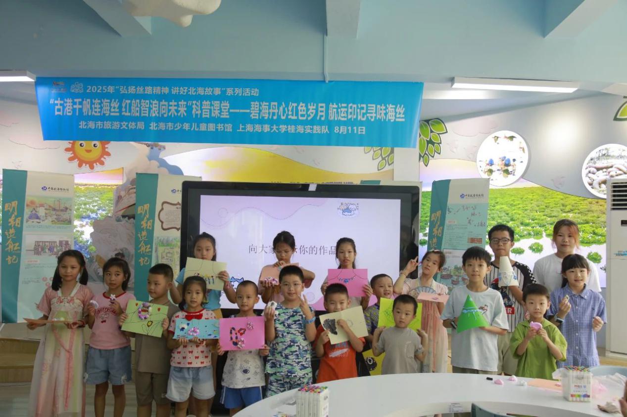 在我国加快发展智慧航运、全力建设海洋强国的时代背景下,2025年8月10日至12日,上海海事大学桂海实践队奔赴千年海丝古港——广西北海,联合中国航海博物馆、北海市少年儿童图书馆,开展“古港千帆连海丝 红船智浪向未来”主题航海文化宣讲活动。这既是贯通古今的海洋文明对话,也是跨越地域的沪桂青春协作,更是为青少年厚植蓝色基因、服务国家海洋强国战略的青春行动。