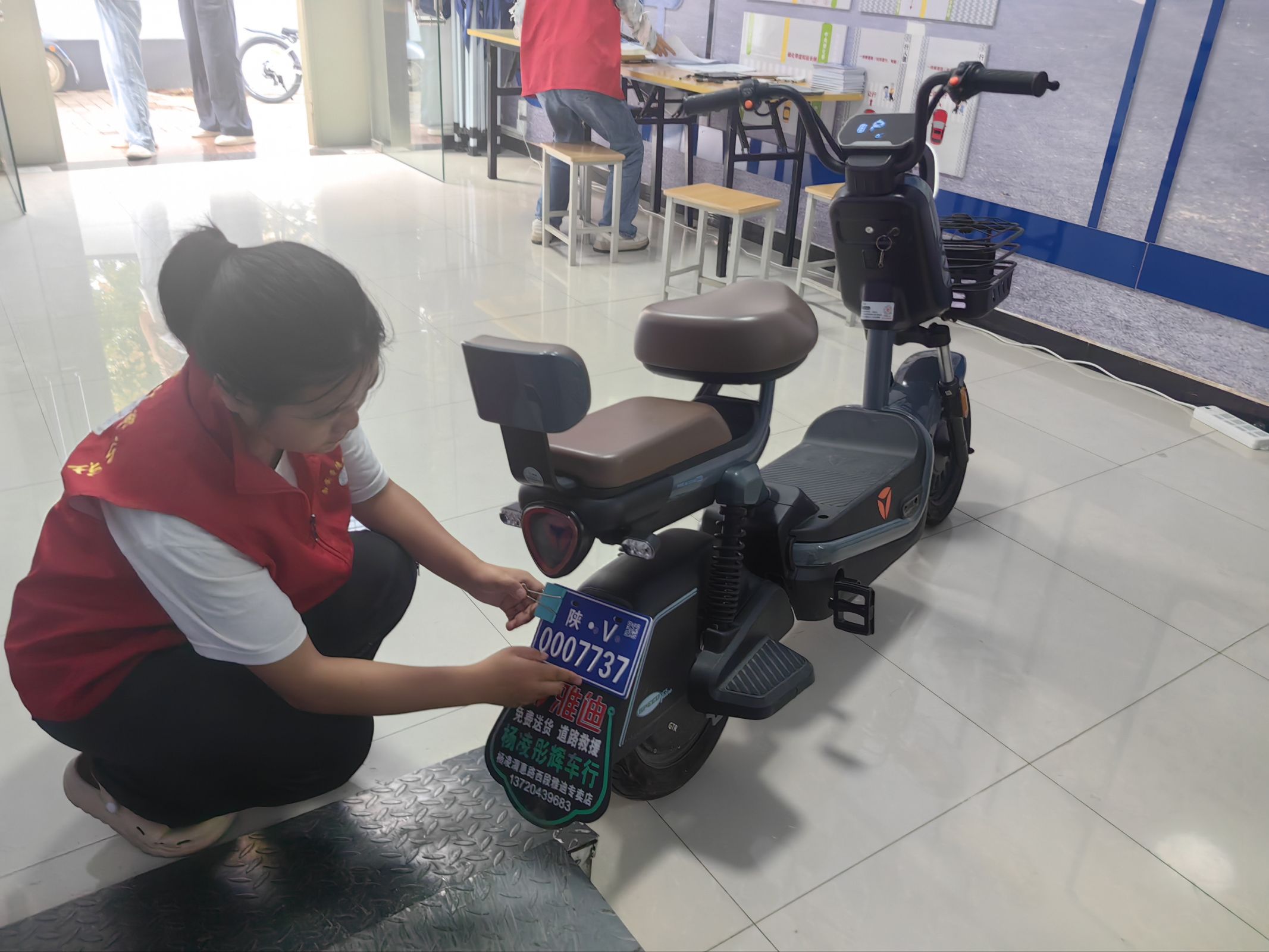 图为实践团在杨凌示范区交通劝导教育站进行电动车挂牌服务