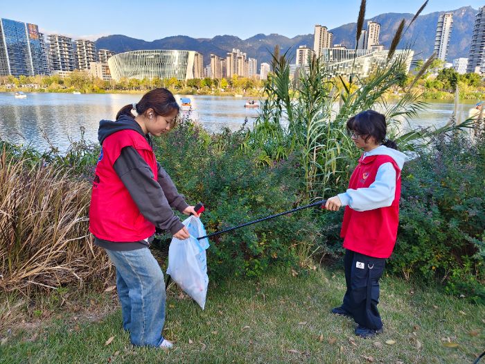 活动当天,支部成员与台胞青年志愿者一同抵达晋安湖畔,在“惠容微家”志愿服务中心专业志愿者的指导下,系统学习了生态环保知识和河道垃圾分类清理技巧,为后续实践活动筑牢基础。随后,支部成员联合台胞朋友分成若干小组,开展了以“护河爱水,清洁家园”为主题的环保实践,重点整治白色污染与沿岸废弃物。活动尾声,支部成员与志愿者们齐聚鼓山镇志愿服务驿站,面向志愿旗帜庄严宣誓,铿锵有力的誓词彰显了志愿者们践行志愿精神、守护生态环境的坚定决心。