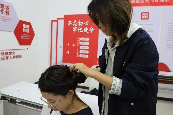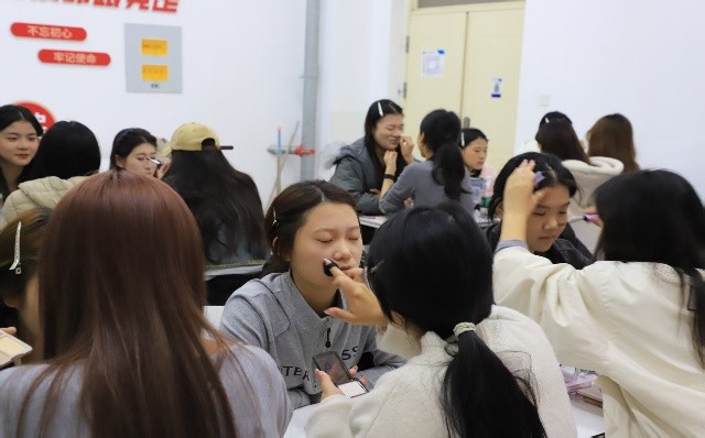 实践环节中,同学们自带职业装、古风装等服饰,两两分组为对方打造整体造型——有人以简约妆容搭配职业装展现专业气质,有人以襦裙配盘发还原古风韵味,在互相调整细节的过程中,摸索适合自身的风格,自信感与审美表达力同步提升。