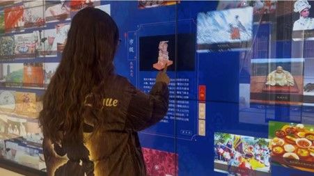 此次调研中,最引人注目的莫过于馆内的非遗展示大屏。在“南京非遗鉴赏”魔屏展厅,巨大的触控屏幕上整合了所有非遗项目的详细资料,团队成员轻触屏幕,即可通过文字、图片、视频等形式了解感兴趣的非遗文化,部分项目还支持3D全方位展示,手指滑动便可360度观察非遗作品的细节肌理。从南京剪纸“花中有花、拙中见灵”的艺术风格,到秦淮灯彩“灿若星河”的制作工艺,再到南京泥塑“三分塑、七分彩”的独特技法,智能化展示让原本静态的文化遗产变得生动可感。团队成员也上手进行了体验,通过数字技术沉浸式感受绒花的精细缠绕、云锦的经纬交织,深刻体会到科技为非遗传承带来的创新可能。