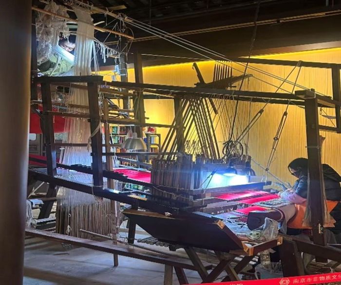 在南京云锦展区,团队成员被眼前的景象深深吸引。两架高达四米的大花楼织机巍然矗立,两位工艺人正默契配合进行织造作业:拽花工端坐织机上层,双手提拉丝线,通过精准的力道控制为纹样塑形;织工在下层手持纹刀与飞梭,抓取金线与各色绒管,在“通经断纬”的技法中让锦缎逐渐成形。“嚓嚓”的丝线摩擦声中,金线与彩丝交织出绚丽纹样,光泽流转间尽显“锦中之冠”的华贵。据介绍,南京云锦用料考究,需用到“金纱翠羽”,织造工艺极为复杂,一幅78厘米宽的锦缎需用到1.1万根经线,两位匠人每日工作8小时也仅能织出不足10厘米,正因如此才有“寸锦寸金”的美誉。工艺人现场演示的“挑花结本”技艺,将图案拆解为纵横交错的小格子,如同为织机编写“程序”,让团队成员直观感受到非遗技艺中蕴含的古人智慧。