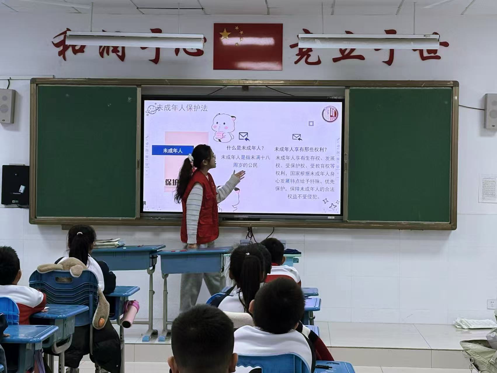 为深入贯彻落实《中华人民共和国未成年人保护法》及《预防未成年人犯罪法》,切实提升未成年人法治意识与自我保护能力,营造全社会共同守护未成年人健康成长的良好氛围,2026年1月29日上午,一场主题为“法护花蕾,守‘未’成长”的普法宣讲活动在东营市史口镇中心小学生动开展。湘潭大学法学学部“返家乡”大学生宣讲员曹文萱和山东大学法学部李佳欣担任主讲人,为现场90余名学生带来了一堂生动而深刻的法治教育课。