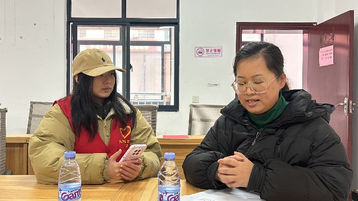 图为队员赵心悦在红旗社区党群活动中心对社区负责人进行活动感受采访