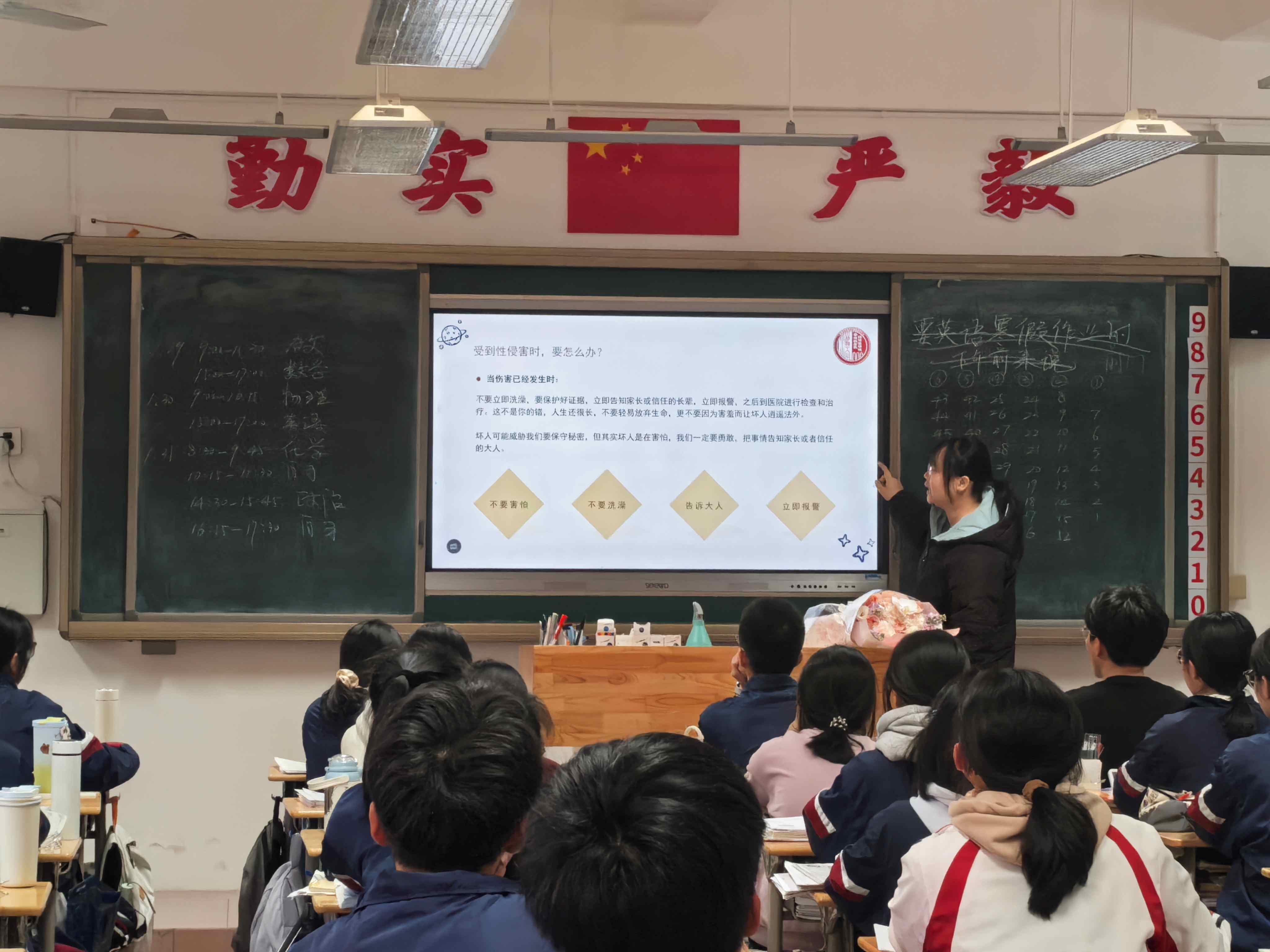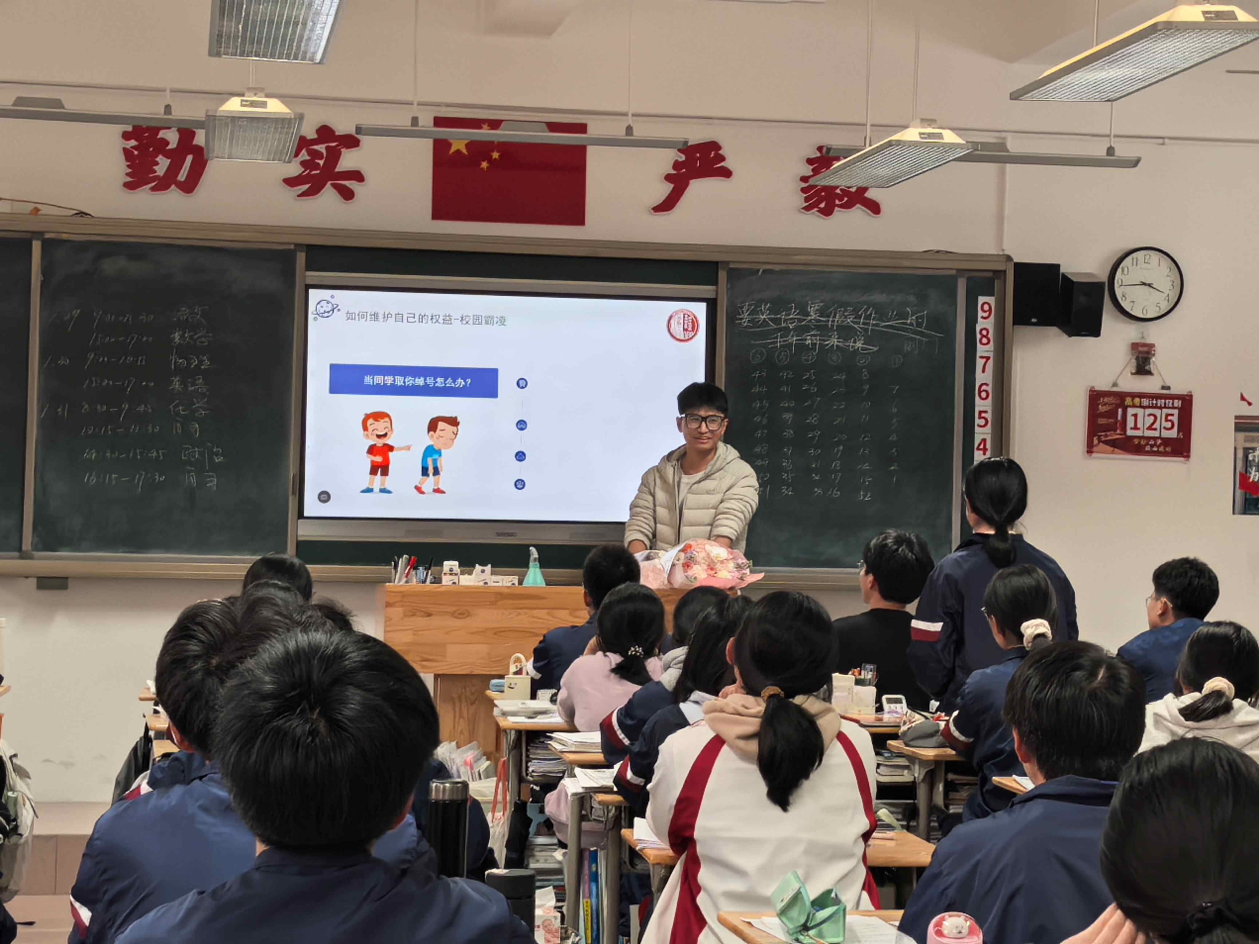 紧接着,宣讲员汪伟钊围绕“校园霸凌以及如何自救”进行深度解读。他结合校园生活中的真实案例,明确了校园霸凌的法律定义、表现形式及危害后果,重点传授了遭遇霸凌时的自我保护方法——包括及时向老师家长求助、保留证据、合法维权等关键步骤,鼓励同学们勇敢对校园霸凌说“不”,学会用智慧和法律保护自己。