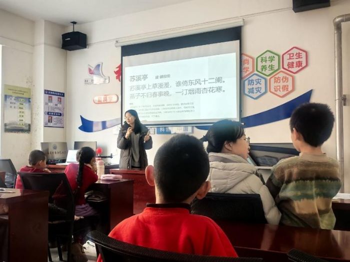 当天下午,清华大学的支教同学将孩子们带入了诗词的世界,在文字里编织其关于四季的梦境。《苏溪亭》的春雨与思念、《山居秋暝》的秋气与清幽等,让孩子们身临其境,也萌生出了用自己的笔触来描绘眼中四季的想法。支教同学抓住这一契机,邀请山东大学的同学与孩子们共同开展诗歌创作活动。孩子们的想象力被充分激发,“冬日里光秃秃的杨树上长满了新年装饰”“秋收后,草垛们零零散散地在田埂上站岗”等等充满童趣的诗句纷纷诞生,用天真的笔触勾勒出家乡四季的鲜活模样。