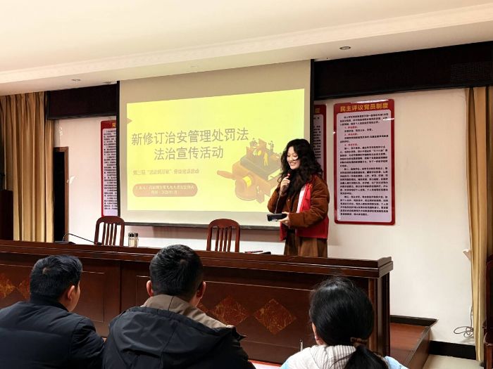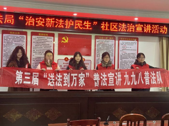 九九八普法队讯(通讯员 李慧 严青秀 黄淑琪)为深入贯彻《中华人民共和国治安管理处罚法》,切实提升社区居民的法治素养与自我保护意识,2月5日,湘潭大学“送法到万家”普法宣传志愿者团队走进恩施市五峰山社区,开展“新修订治安管理处罚法”主题宣讲活动。大学生宣讲员刘晨璐担任主讲人,为现场社区居民带来了一堂生动且实用的法治教育课。
