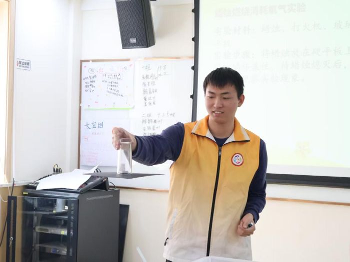 课程设计注重激发儿童的科学兴趣与探索精神。志愿者黄平康主导的“大气压强的奥秘”科学实验课,通过设问导入与动手实践相结合的方式展开,以“向两张垂直放置的纸张中间吹气后其运动状态”的预测为起点,在绝大多数儿童预测“分离”的情况下,由两名儿童上台操作验证了“靠拢”的实验现象。后续进行的覆杯实验、蜡烛燃烧消耗氧气实验,进一步以直观方式揭示了大气压强的存在与作用,孩子们表现出浓厚的兴趣与积极的思考。