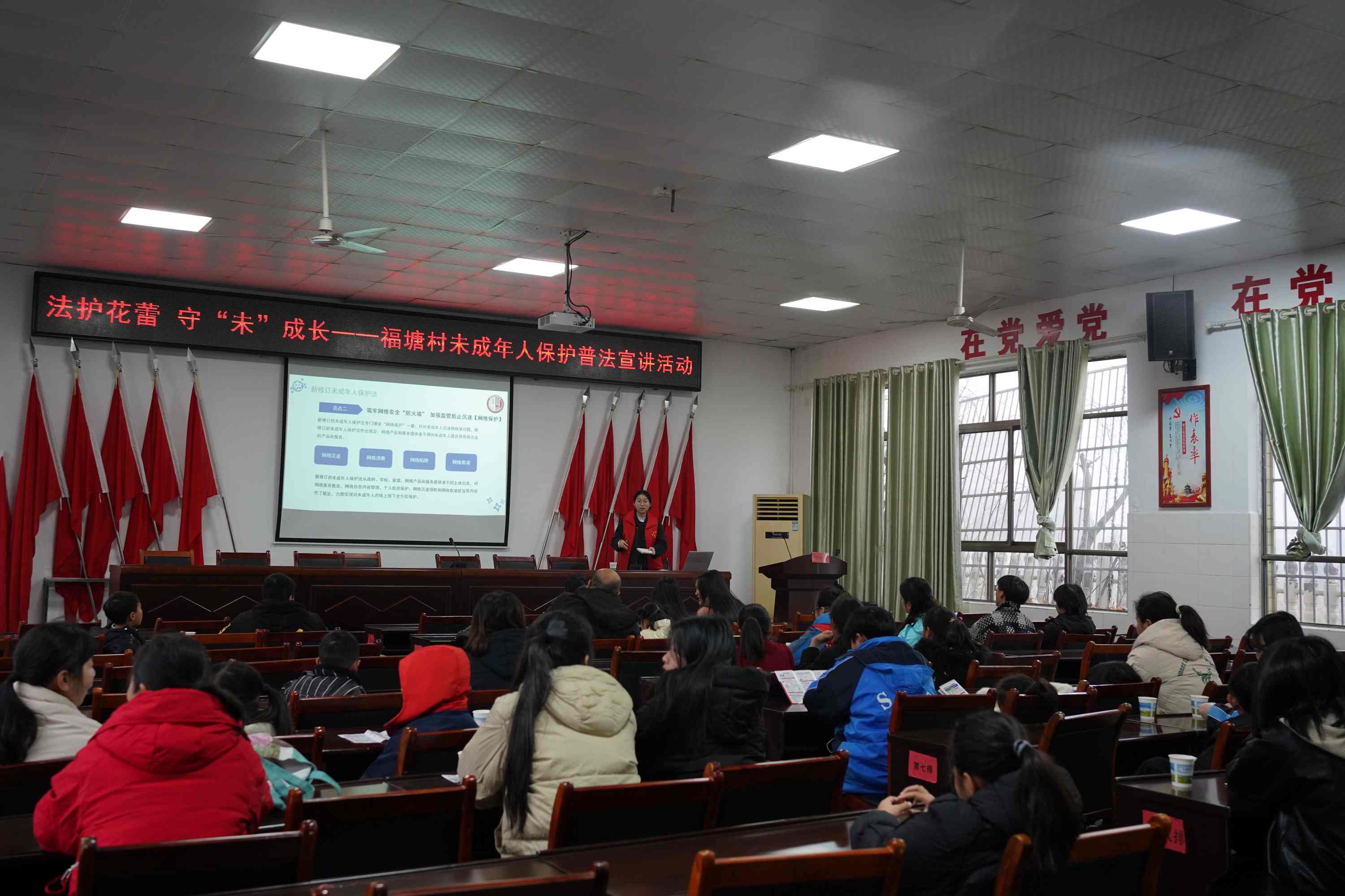 志愿者深谙乡村未成年人保护的现实需求,结合前两站宣讲经验,针对性优化福塘村宣讲内容,让法治知识既专业精准又贴合乡村实际。宣讲中,志愿者以司法神兽獬豸“辨是非、明善恶”的神话故事开篇,迅速拉近与现场群众的距离,随后系统解读《未成年人保护法》“家庭保护、学校保护、社会保护、网络保护、政府保护、司法保护” 六大体系核心要义。针对乡村留守儿童较多的特点,她重点强调监护人监护职责与委托监护规范;结合青少年网络接触频繁的现状,详解 “未满16周岁不得开通网络直播”“未成年人大额打赏可依法追回” 等网络保护条款,并用最高人民法院相关典型案例让条款更易理解;面对校园霸凌、性侵害等高发风险,她通过情景模拟教孩子们识别隐私部位、拒绝不当接触,牢记“勇敢说不、及时求助、保留证据”的自救口诀,同时向家长普及侵害未成年人案件强制报告制度,明确维权路径。