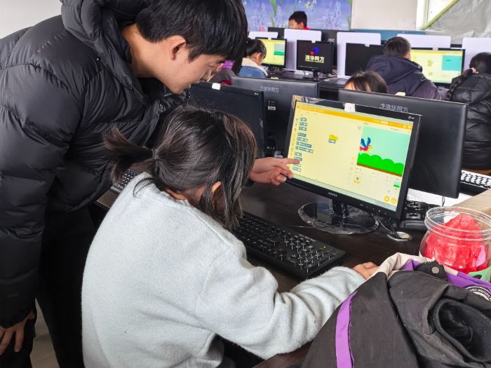 编程课堂上,队员打破“编程晦涩难懂”的刻板印象,以Scratch图形化编程为载体,用“搭积木”的方式引导孩子们走进编程世界。队员从简单的角色创建、指令拖拽入手,耐心讲解循环、条件判断等基础编程逻辑,结合多个趣味案例,让抽象的编程知识变得直观易懂。孩子们专注聆听、积极尝试,在队员们的一对一指导下,亲手完成属于自己的简易编程作品,脸上洋溢着成就感,创新思维与动手能力在实践中得到有效提升。