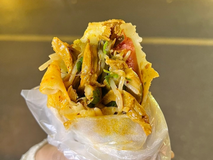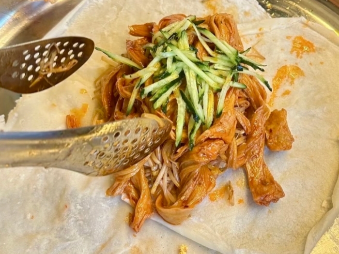 卷膜的起源与阜阳作为物产丰饶的农业地区密不可分,其雏形可追溯至当地人以面皮包裹时令菜蔬的朴素智慧。经过多年的演变与发展,如今的卷膜已成为工艺独特、搭配讲究的成熟小吃。其制作首先讲究面皮的韧性:选用优质小麦粉调成面浆,在特制的平锅上均匀摊烙,形成薄如蝉翼却柔韧不易破的饼皮。核心内馅通常以焯熟的豆芽、面筋、鸡蛋皮为基底,再加入卤制入味的五花肉或牛肚,卤汁的香浓是卷膜风味的灵魂所在。最后,根据食客喜好,抹上蒜泥、辣椒油、芝麻酱,撒上香菜、荆芥,将所有食材置于面皮中央,卷裹成饱满扎实的锥形长卷,一道热气腾腾、层次丰富的卷膜便递到手中。咬下一口,面皮的麦香、卤肉的咸鲜、豆芽的爽脆与酱料的复合滋味在口中交融,尽显阜阳饮食的实在与醇美。