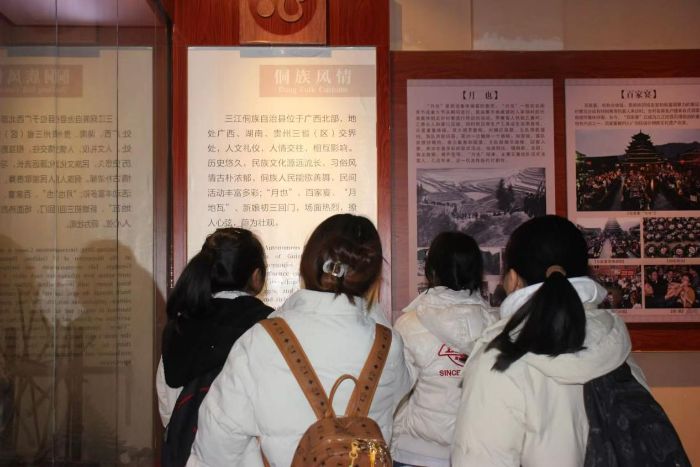 在展厅的另一侧,面对“侗族风情”的展板,团队成员们正仔细对照文字说明,记录着相关的民俗细节。“‘月也’是侗族集体做客的习俗,‘百家宴’则要摆上长桌联排……这些并非孤立的符号,而是织绣纹样中‘稻穗’、‘鼓楼’等元素的生活源泉。”团队成员深刻认识到,非物质文化遗产的“活态”传承,正是技艺与生活紧密相连的生动体现。