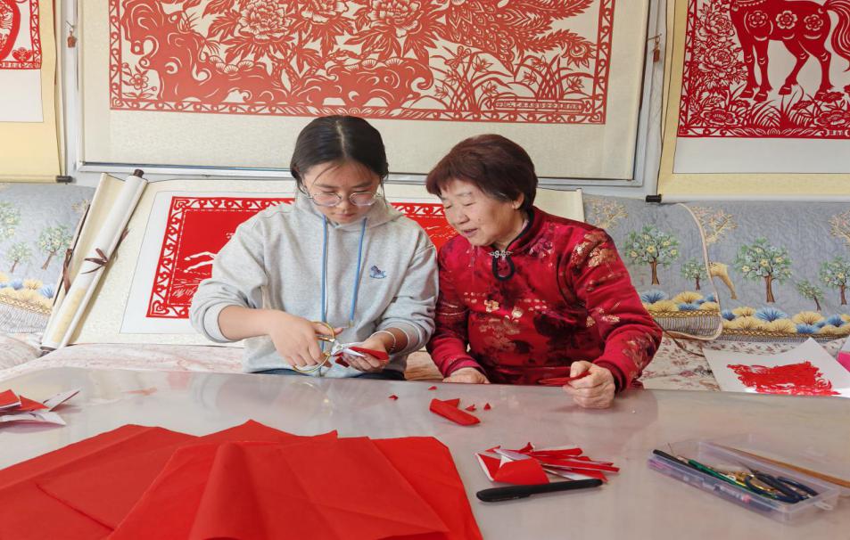 (图为在非遗传承人指导下剪纸的照片 侯心语供图)