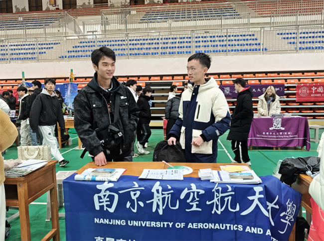在遵义四中:播撒“飞天梦想”的种子 在遵义第四中学,另一支小队则尝试了更灵活的“阵地战”与“游击战”结合模式。白天,他们在学校体育馆设置的咨询摊位,迅速吸引了络绎不绝的同学。“我们本来都担心‘摆摊’可能没几个人来,”队员钱怡回忆,“但刚布置好没多久,就有同学围上来问‘南航的强势专业收分线是多少?’‘大学的课余时间怎么安排?’……”南航为宣传小队发放的数百份南航主题文创,一个小时内就被发放一空。