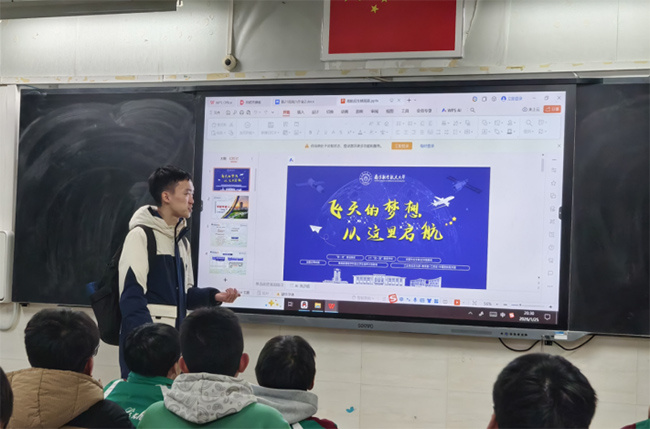 晚上的进班宣讲,除了对南航的全面介绍和招飞介绍,更有与学弟学妹们的深度交流。在三个高一班级里,队长何飞主要负责招飞板块的讲解,而其他团队成员,则重点讲解了南航的强势专业,介绍了直升机和飞行器设计等专业。“作为他们的学长,我们不只是为了给他们宣传南航,也想给他们以后的志愿填报多一些参考,让他们了解到真实的专业前景。”