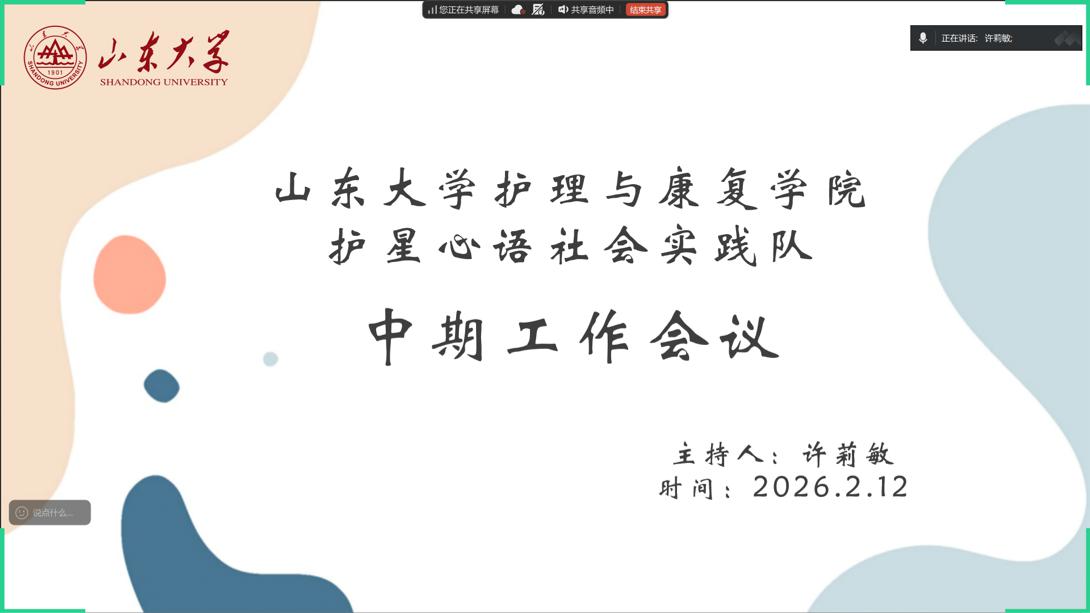 2026年2月13日,护星心语社会实践队召开中期工作会议,围绕孤独症儿童家长一站式心理支持与赋能平台建设进行全面部署。本次会议立足公益初心与社会使命,聚焦服务优化、需求调研、成果展示等关键工作,明确下一阶段发展方向,致力于以更专业、更温暖、更高效的公益行动,为孤独症儿童家长提供全方位心理支持与成长赋能,用实际行动关爱“星星的孩子”及其家庭。