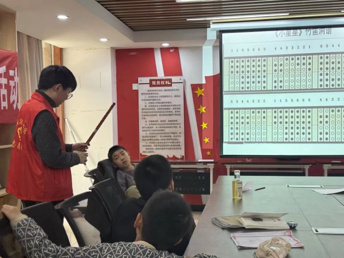 破冰活动过后,特色课程精彩启幕。2 月 24 日下午 2 点,吴景添老师带来了一节生动的民乐启迪课,带领孩子们走进悠扬的民乐世界,探寻笛子的独特魅力。课堂上,老师摒弃枯燥的理论讲解,将丰富多彩的知识讲解与现场实践表演相结合,悠扬的笛音从指尖流淌而出,瞬间吸引了孩子们的全部注意力。在老师的耐心指导下,孩子们纷纷拿起笛子尝试吹奏,从生疏摸索到慢慢吹响,每一个小小的进步都让孩子们充满成就感。这节民乐课,让孩子们在欢乐中感受民乐的动听与魅力,也让热爱民乐的种子在孩子们心中悄然萌芽。