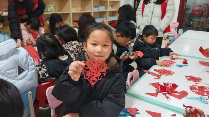 随后进入动手环节。志愿者为每位孩子分发红纸与安全剪刀,并进行分步教学演示。从对折、画图到裁剪,孩子们全神贯注,认真地完成自己的作品。有的孩子动手能力较强,迅速完成第一幅剪纸后,主动挑战更复杂的图案;也有孩子动作稍慢,但在志愿者的耐心指导下,最终也完整剪出了美丽的图案。其中,一位幼儿园大班的小朋友表现尤为突出——她不仅高质量完成了两张剪纸作品,还主动帮助身边同伴折叠纸张、纠正剪裁顺序,展现出良好的协作意识与动手能力,赢得在场志愿者的一致称赞。