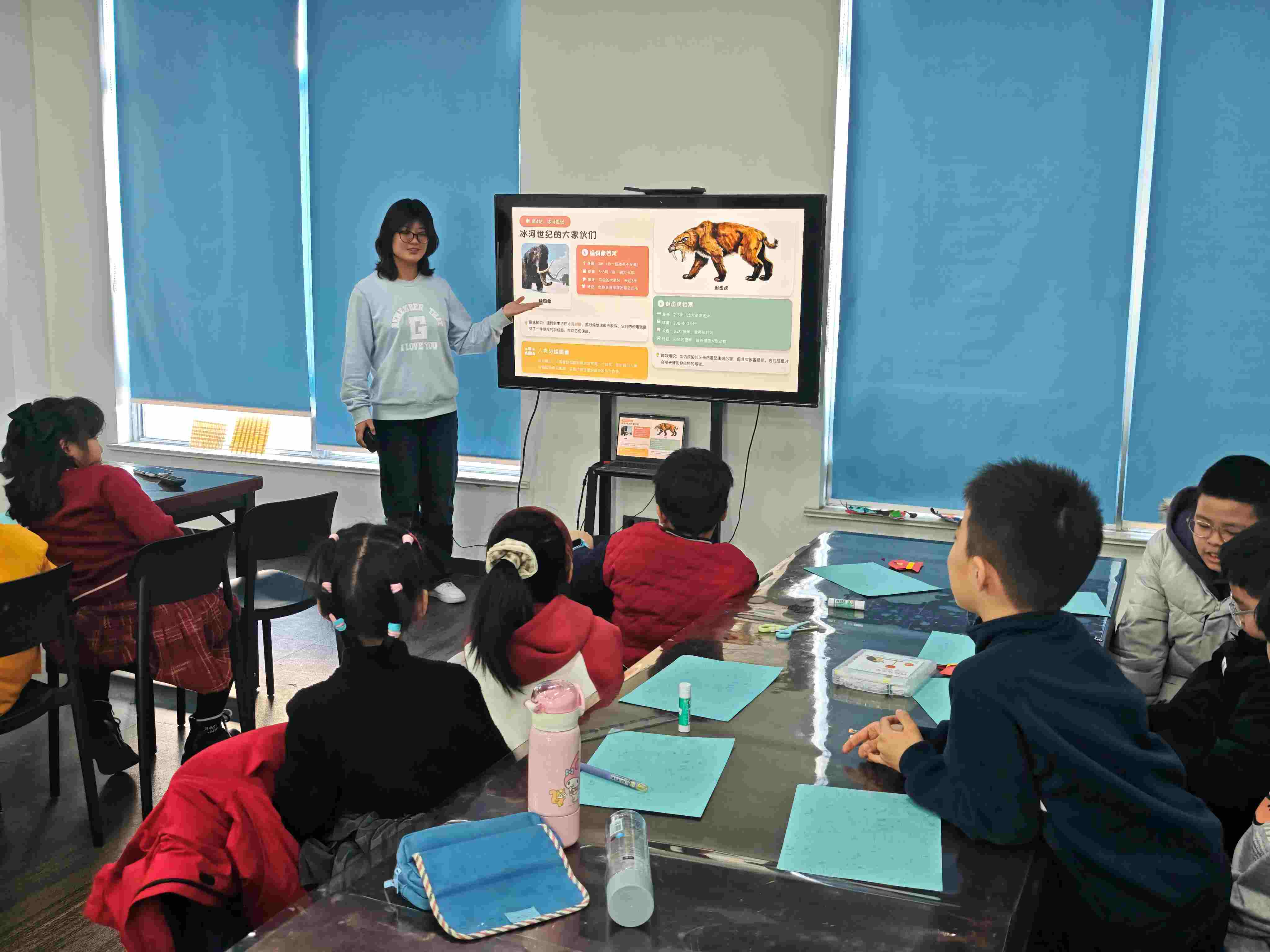 第二节课,志愿者们带来了精心准备的“史前生物大揭秘”科普课程。大屏幕上,地球46亿年的生命演化史如时光长河般缓缓展开——从5亿年前海洋中的三叶虫,到统治地球1.6亿年的恐龙家族,再到冰河世纪的猛犸象与剑齿虎,孩子们仿佛乘坐时光机,亲历了生命演化的壮阔历程。