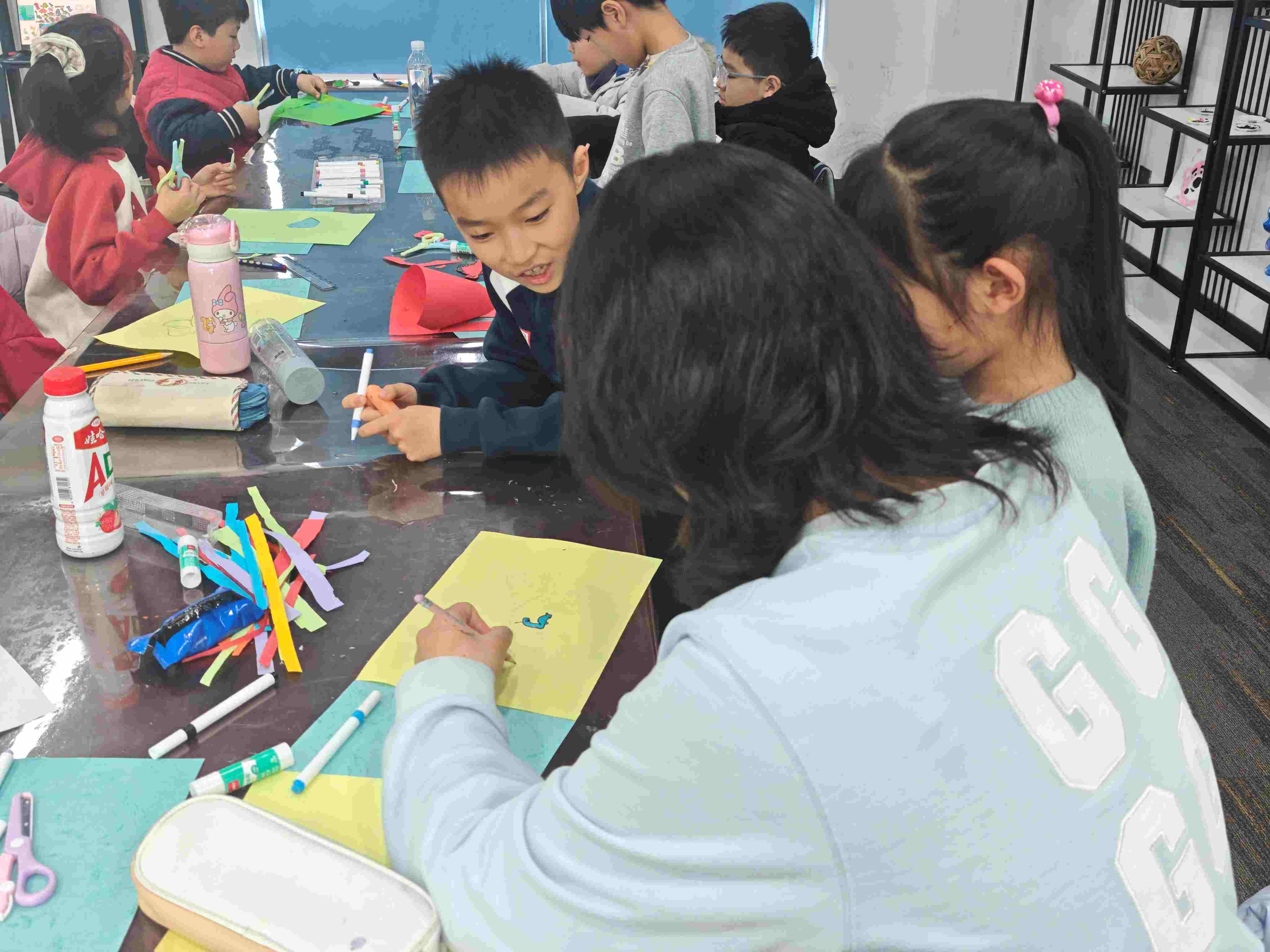 知识的探索之后,是创意的绽放。在“小小考古学家”手工环节,每个孩子都化身为古生物艺术家,用彩纸、剪刀和画笔创作属于自己的恐龙作品。