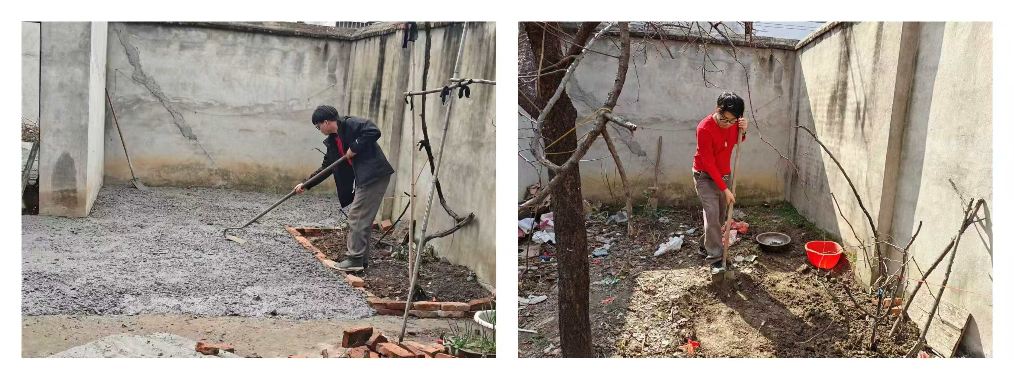 图为朱恩泽正在院中起土和浇筑水泥。朱恩泽供图