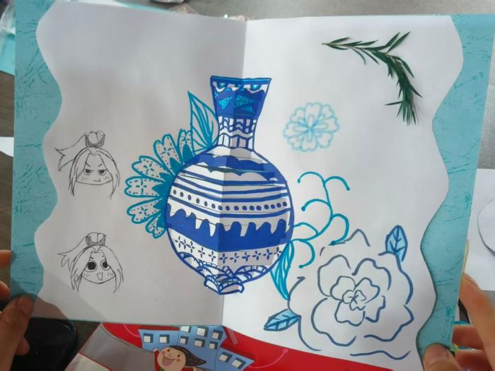 当一件件带着童真温度的立体青花瓷在孩子们手中缓缓成型,课堂里也渐渐漾起了惊喜与欢喜。素纸为胎,剪刀作笔,孩子们用稚嫩却认真的手法,将心中对美的想象一点点裁剪成型。原本平凡的纸张,在一双双小手的精心创作下,渐渐化作亭亭而立的青花瓶,线条虽不完美,却满是灵气;纹样虽显稚拙,却藏着最纯粹的热爱。孩子们纷纷高举着自己的作品,眼中闪烁着自豪与光亮,笑容明亮而灿烂,如同春日里破土而出的新芽,为这堂传统文化课堂添上了最动人的色彩。