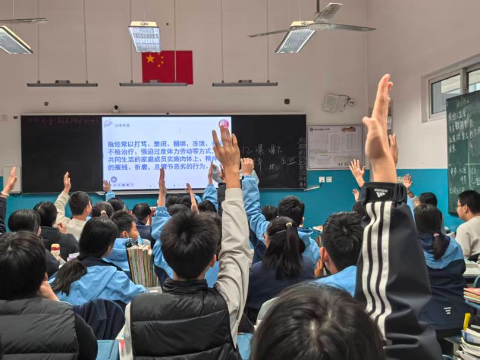 为了提高活动的参与度与趣味性,现场设置了“有奖问答”活动,如“我当小法官”“看解释猜法律术语”等互动环节。“未满16周岁的小美可以开网络直播吗?”“遭遇校园欺凌后该怎么办?”志愿者接连抛出与学生息息相关的法律问题,同学们踊跃举手、积极抢答,在轻松的游戏中巩固了法律知识,深化了对法治理念的理解。互动结束后,志愿者为参与答题的学生送上小礼品,鼓励大家争做“知法、懂法、守法、用法”的时代新青年。