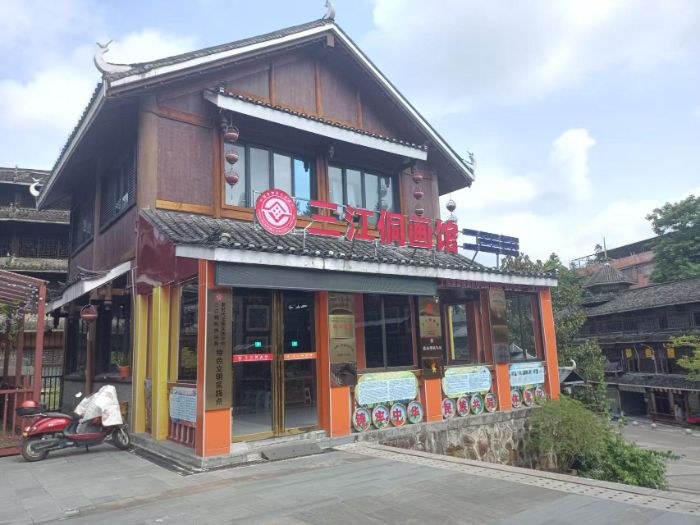 作为侗族文化的精神地标,三江鼓楼不仅是建筑艺术的瑰宝,更是侗画创作的重要灵感源泉。实践团队走进鼓楼,在飞檐翘角的匠心巧思与雕花纹样的文化印记中,感受侗族民众聚楼议事、对歌传情的民俗底蕴,也为解读侗画中高频出现的鼓楼、风雨桥等文化符号筑牢了认知基础。随后,团队走进三江侗画馆,与这门承载着侗族千年智慧的非遗技艺展开深度对话,开启了一场兼具观赏性与实践性的文化之旅。