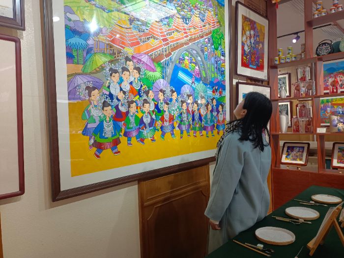 馆内展厅中,传统与创新交织的侗画作品令人目不暇接:既有还原侗族农耕、节庆等生活场景的经典画作,笔触质朴、充满烟火气;也有融入乡村振兴、民族团结等时代主题的创新作品,立意新颖、富有感染力。其中,一幅聚焦侗族“三月三”歌节的作品尤为吸睛,明黄底色搭配大胆撞色,将身着盛装的侗族儿女、层叠飞檐的风雨桥、青山环抱的侗寨完美融合,生动再现了侗乡节庆的欢腾景象,让队员们直观感受到侗画“源于生活、高于生活”的艺术魅力。