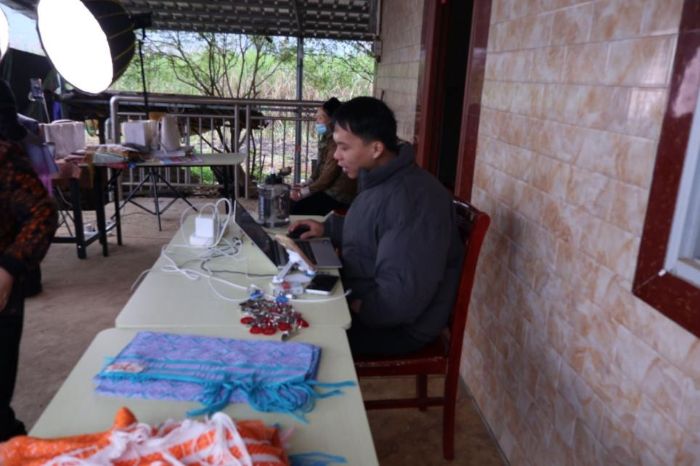 在与抖音网红“屯村日记”取得联系后,实践团队成员前往他的直播现场。“屯村日记”由原驻村书记周立华(笔名周耒)运营,目前已积累近50万粉丝,其核心特色便是打破传统非遗传播与销售的壁垒,将壮锦产品与壮族文化深度绑定,大力推动了“非遗+电商”的产业化发展。