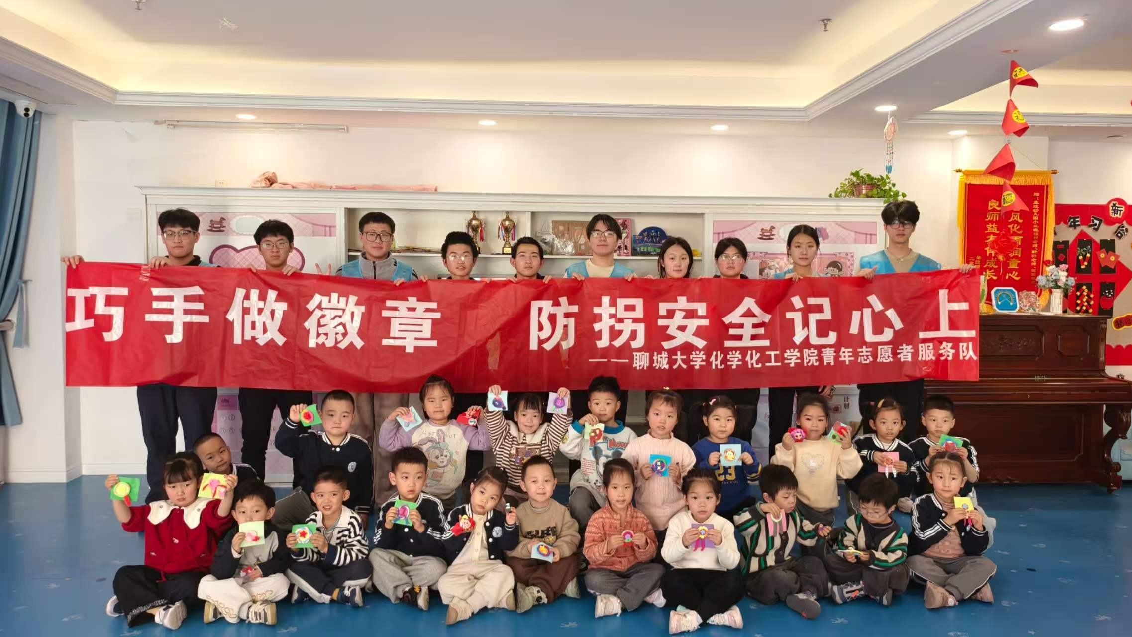 为增强小朋友们的防拐防骗安全意识,提高自我保护能力,1月23日,化学化工学院益暖志愿服务队于聊城市东昌府区孟达幼儿园举办“巧手做徽章,防拐安全记心上”志愿服务活动。