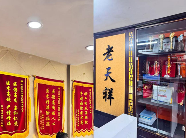 三、荣誉鉴岁月,责任映商魂 在荣誉展示区,锦旗与奖杯静静诉说着老天祥的责任担当。从抗疫期间保障供应、送药上门,到日常义诊、帮扶邻里,这家百年老店始终以“医者仁心”践行承诺。一面面“医德高尚”“妙手回春”的锦旗,是百姓的信赖,更是老字号“卖药存侠心,行医有仁心”的生动注脚。我们从中读懂:真正的商道,是把责任刻进岁月,让温暖代代相传。