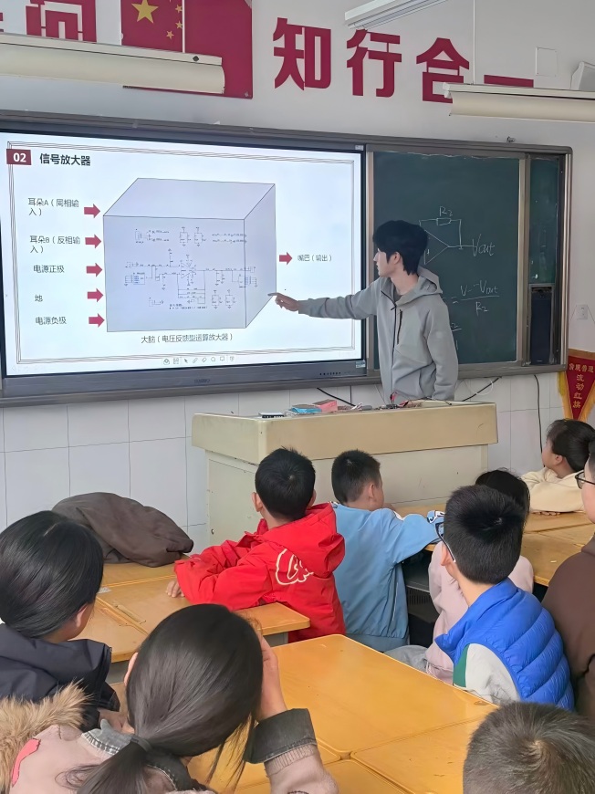 器件产生的电信号微小而复杂,如何让它“说话”?第二位同学以“脑袋”为比喻,讲解了电路系统的作用。他展示了我们项目中的的信号处理模块。当孩子们亲眼看到模拟摔倒动作触发警报灯闪烁时,现场响起了阵阵惊叹。这一环节让青少年认识到,再前沿的科技也离不开扎实的硬件基础,每一个“智能”背后都是精准的电路设计。