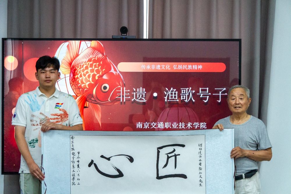 弘扬工匠精神实践团通过学习、传唱渔歌号子,了解到到非物质文化遗产保护的重要性。实践团成员杨天佑向陆老赠送了自己书写的书法作品—《匠心》,这是对陆老长期以来致力于传承和弘扬渔歌号子的敬仰。陆老“择一事终一生”的执着专注、“干一行专一行”的精益求精的精神和态度,更是激励着实践团每一位成员,脚踏实地,用实干成就梦想,在平凡中彰显不凡,汇聚砥砺奋进的强劲动能。