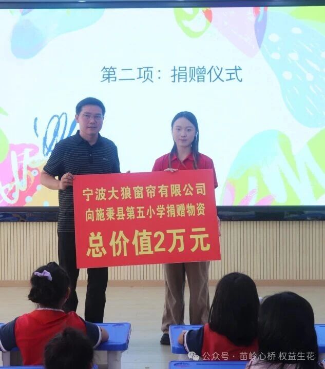 在随后举行的捐赠仪式上,宁波市尤耐克有限公司和宁波大狼窗饰有限公司分别向学校捐赠了价值2.5万元和2万元的教学物资,这些物资将用于改善学校的办学条件。校方代表与实践队共同完成了捐赠物资的交接工作。