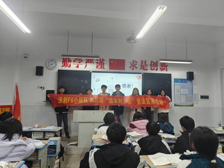 2026年2月4日,在共青团湖南省委的指导下,由湘潭市相关单位与湘潭大学联合主办的第三届“送法到万家”普法宣讲活动走进湖南省常宁市第二中学。湘潭大学“法刺F6小纵队”作为志愿者团队,面向该校25级火箭班学生开展了一场以“未成年人保护与犯罪预防”为主题的沉浸式法治宣讲,旨在提升青少年的法律意识与自护能力,推动优质普法资源深入基层。