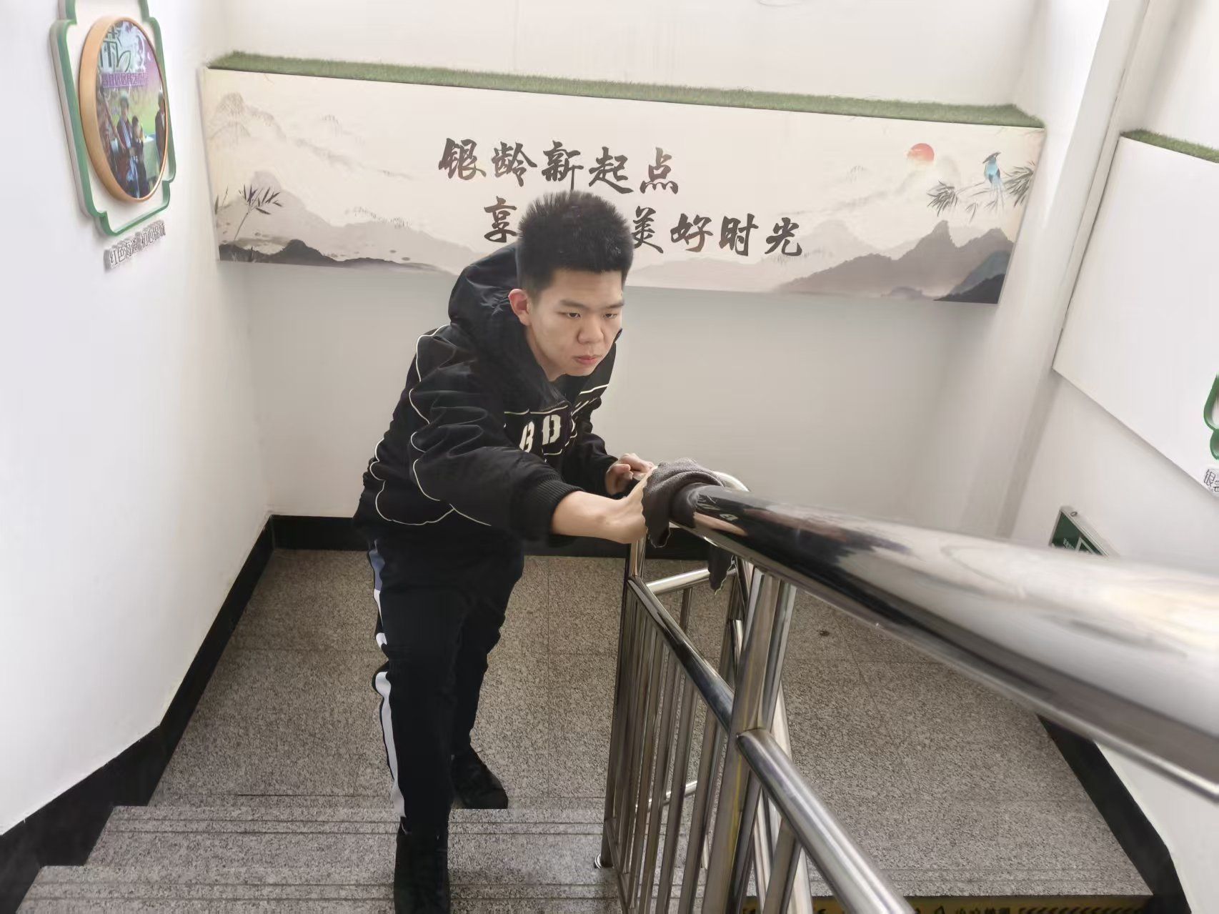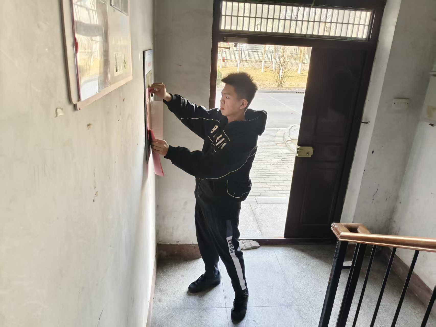 图为实践团成员在楼道内粘贴警示标语